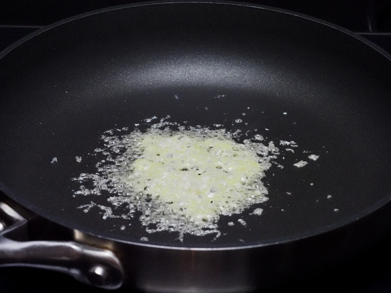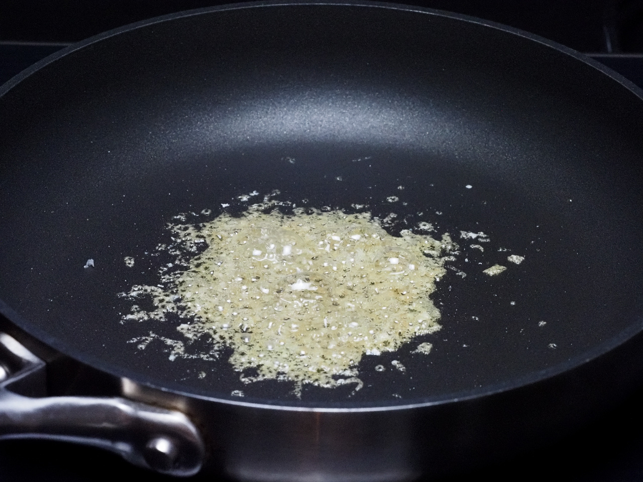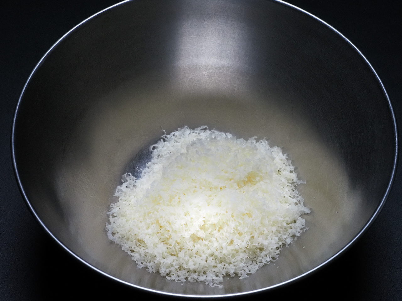 を押します。170℃に加熱します。170℃に達しアラームが鳴ったら、大さじ1〜2くらいのパルミジャーノをサッと薄くフライパンに敷き