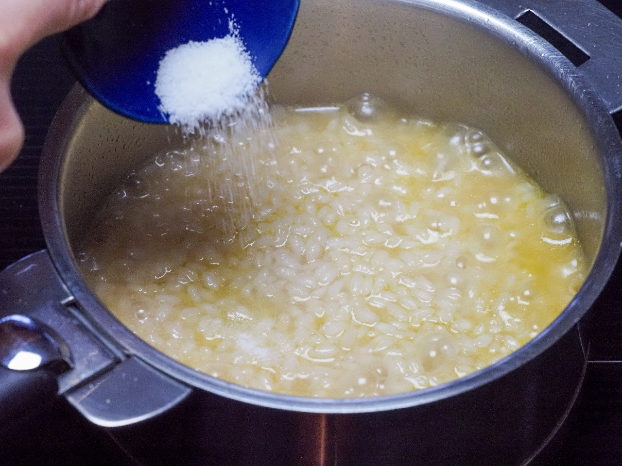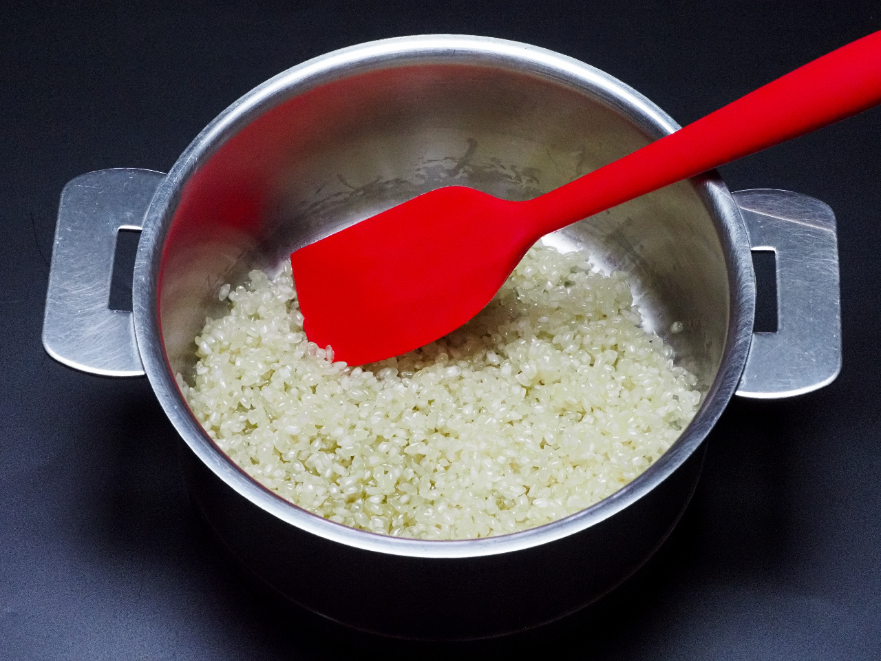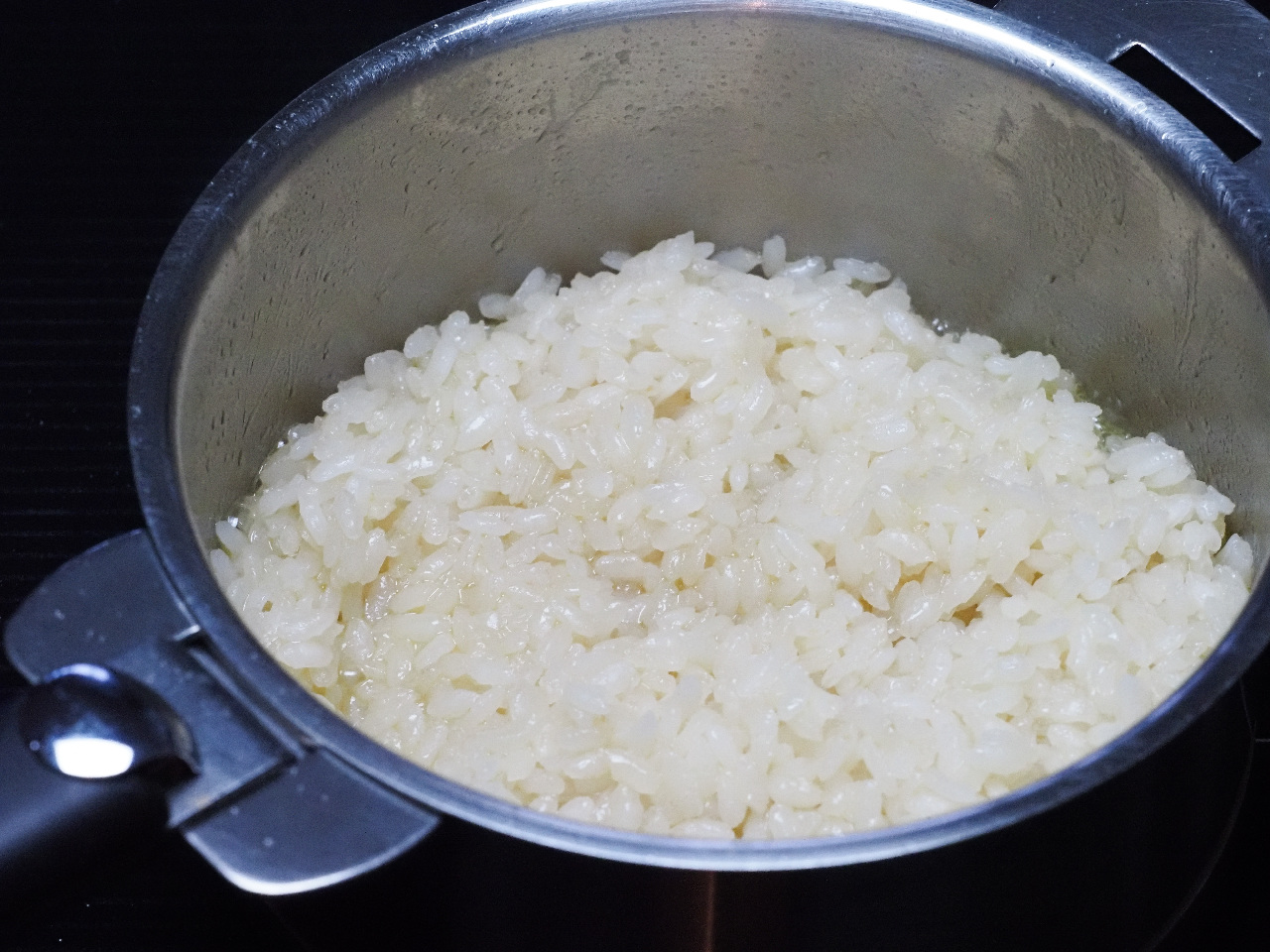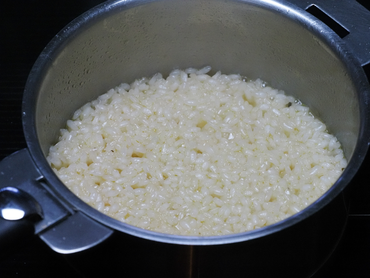をタップしてください。米を炒めます。5分経過すると米の表面が白くなってきます。アラーム音が鳴ったらすぐにブイヨン200mlを入れてください。