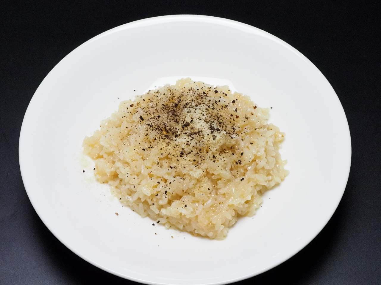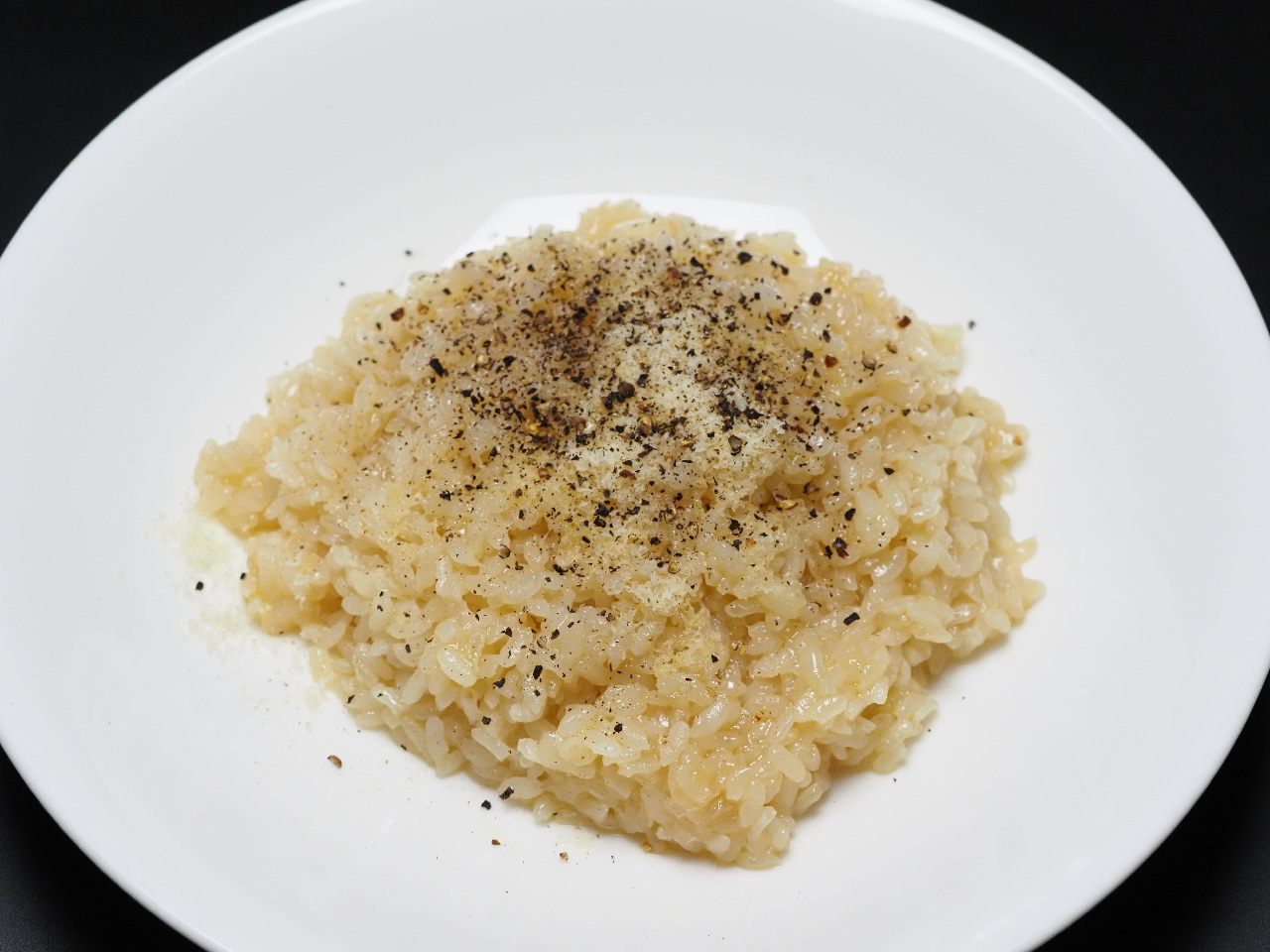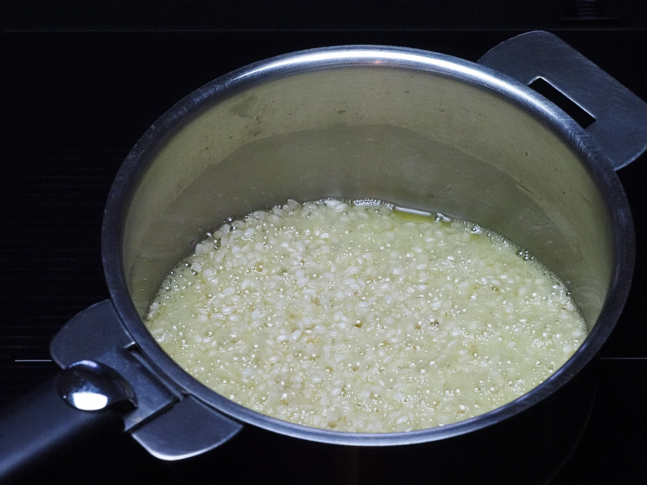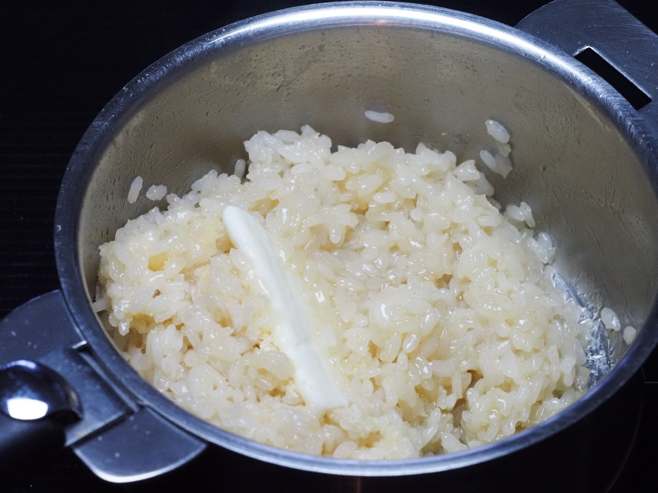 をタップしてください。米を炒めます。5分経過すると米の表面が白くなってきます。アラーム音が鳴ったらすぐにブイヨン200mlを入れてください。