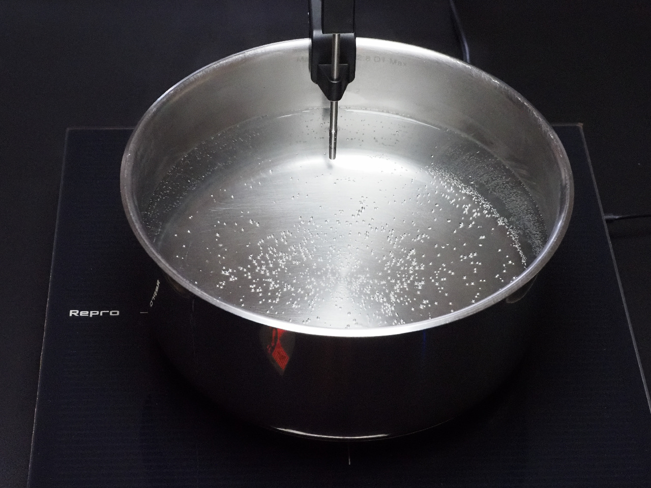 をタップしてください。70℃に加熱します。ボウルには冷水をためておきます。