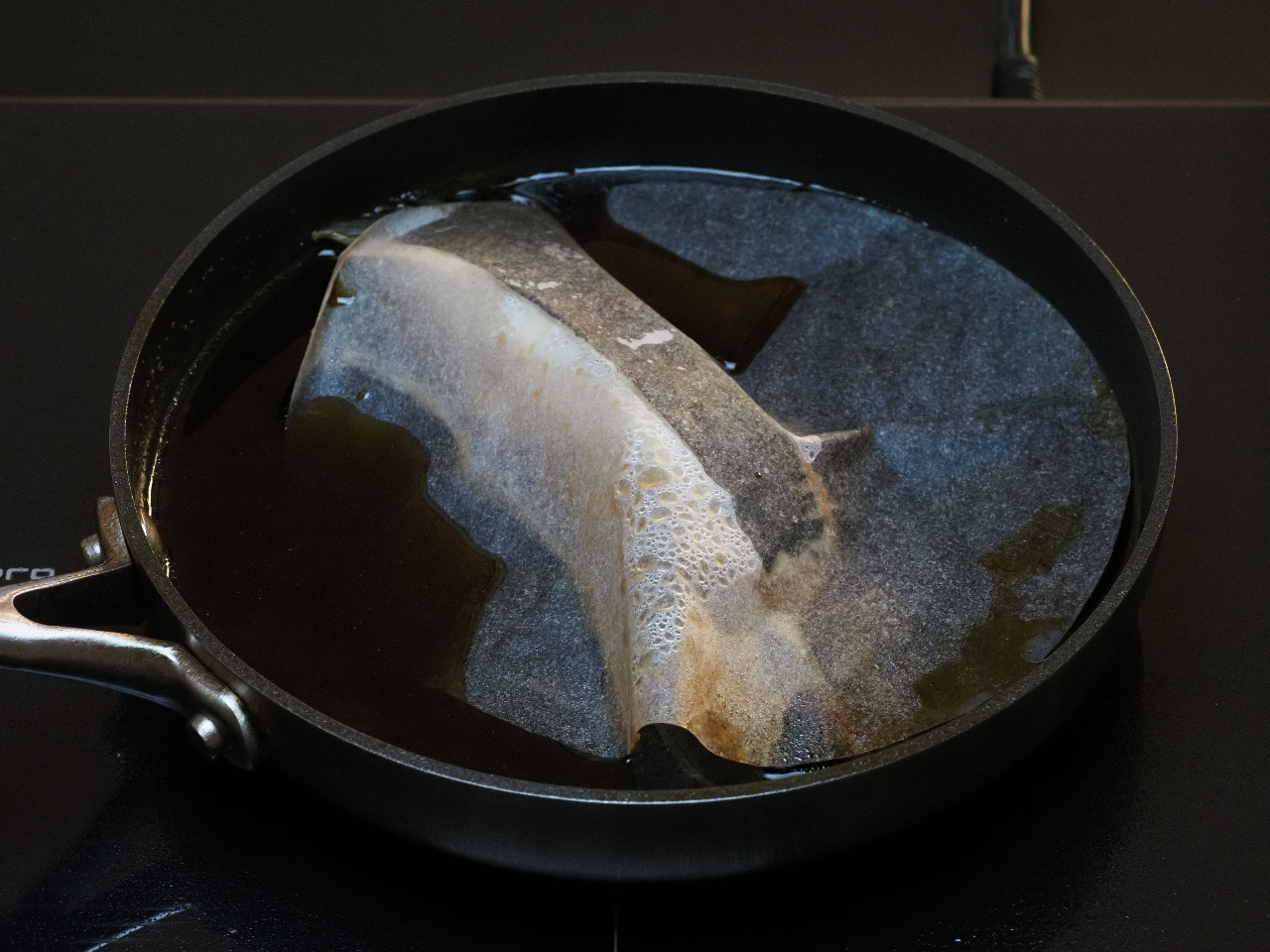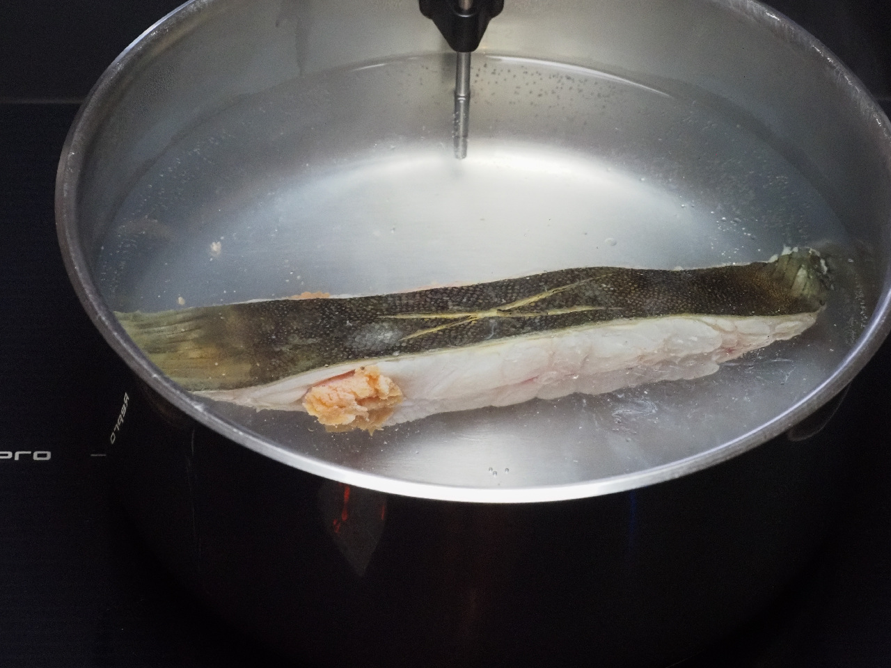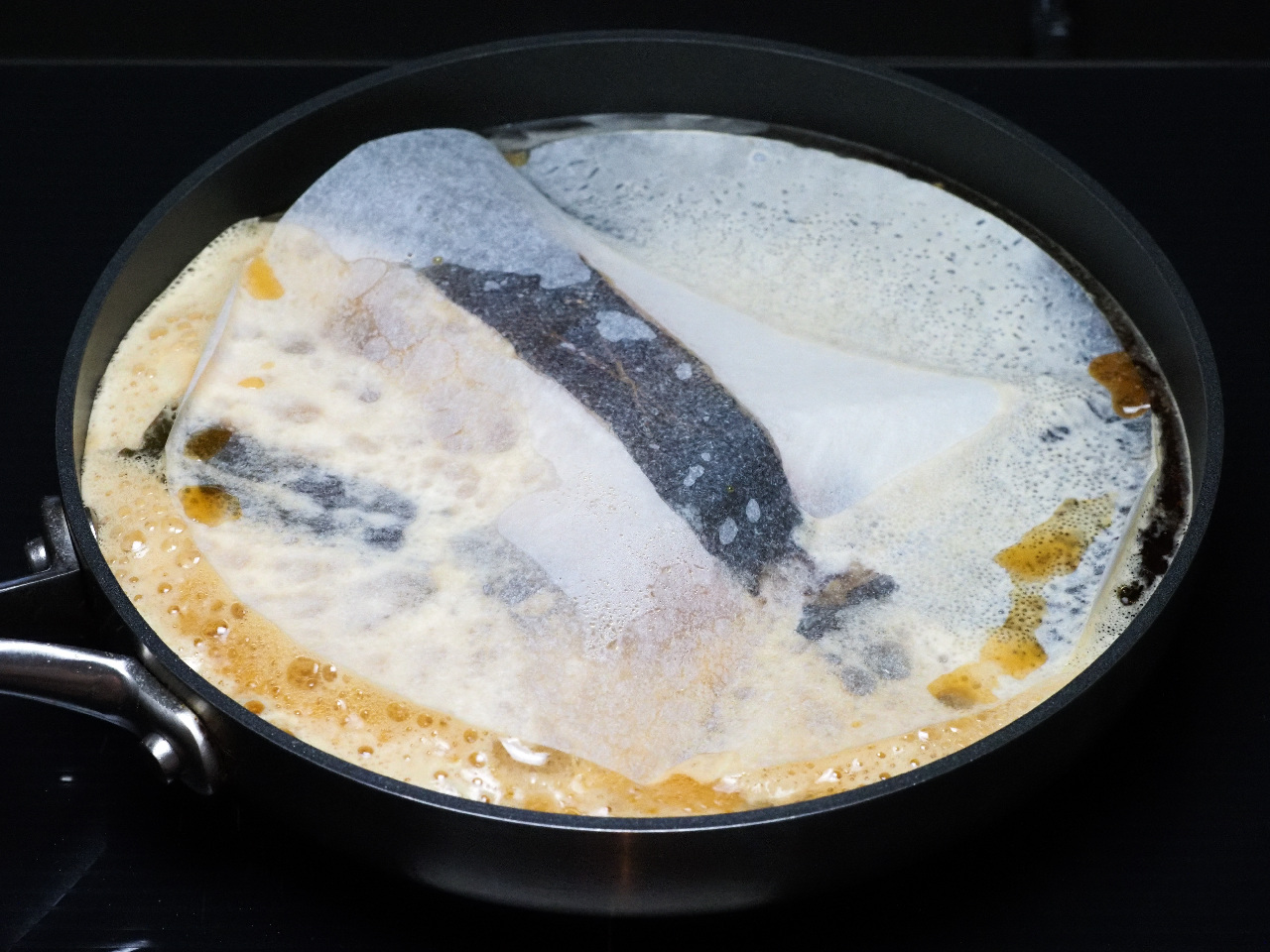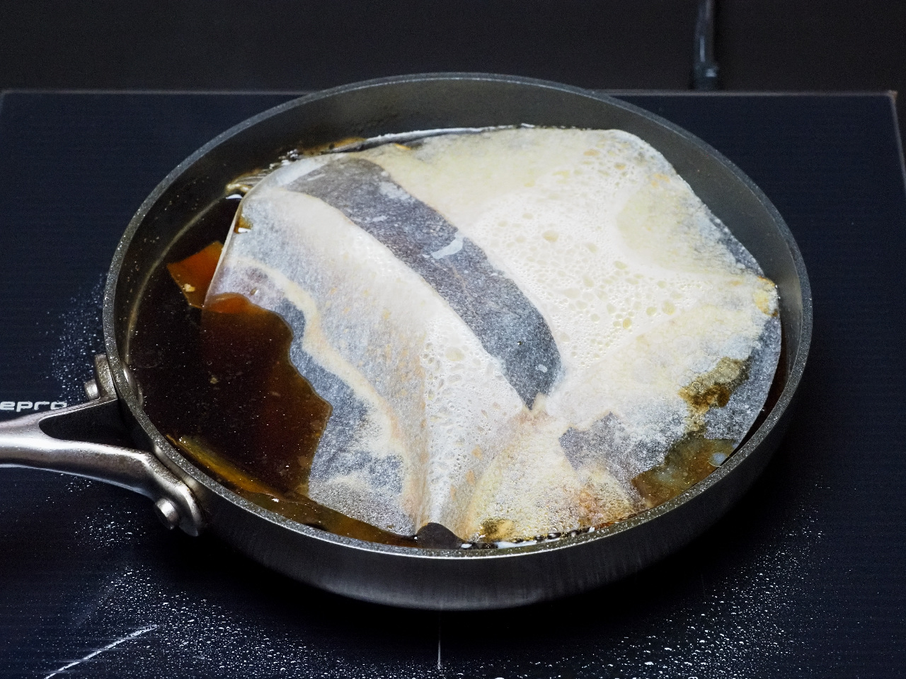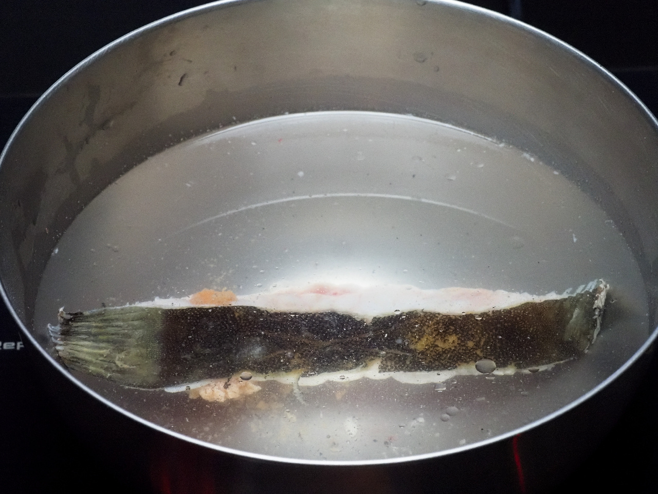 をタップして、かれいの切り身を沈めます。30秒間湯通しして身の表面が白くなったら穴開きおたまなどでかれいを引き上げてください。