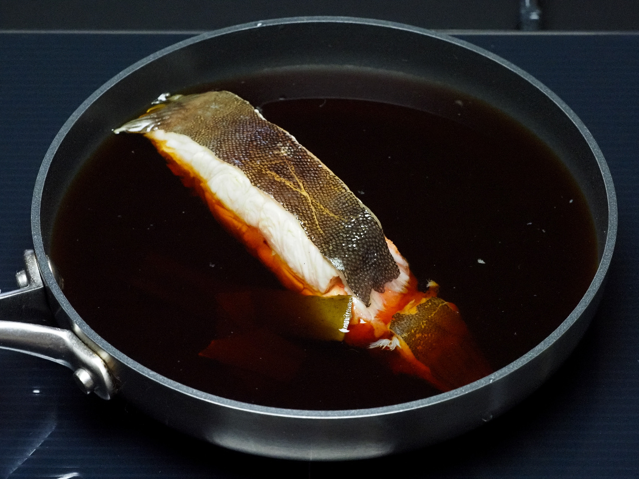 をタップして身が崩れないようにお皿に盛り付けます。煮汁を煮詰めたい場合には