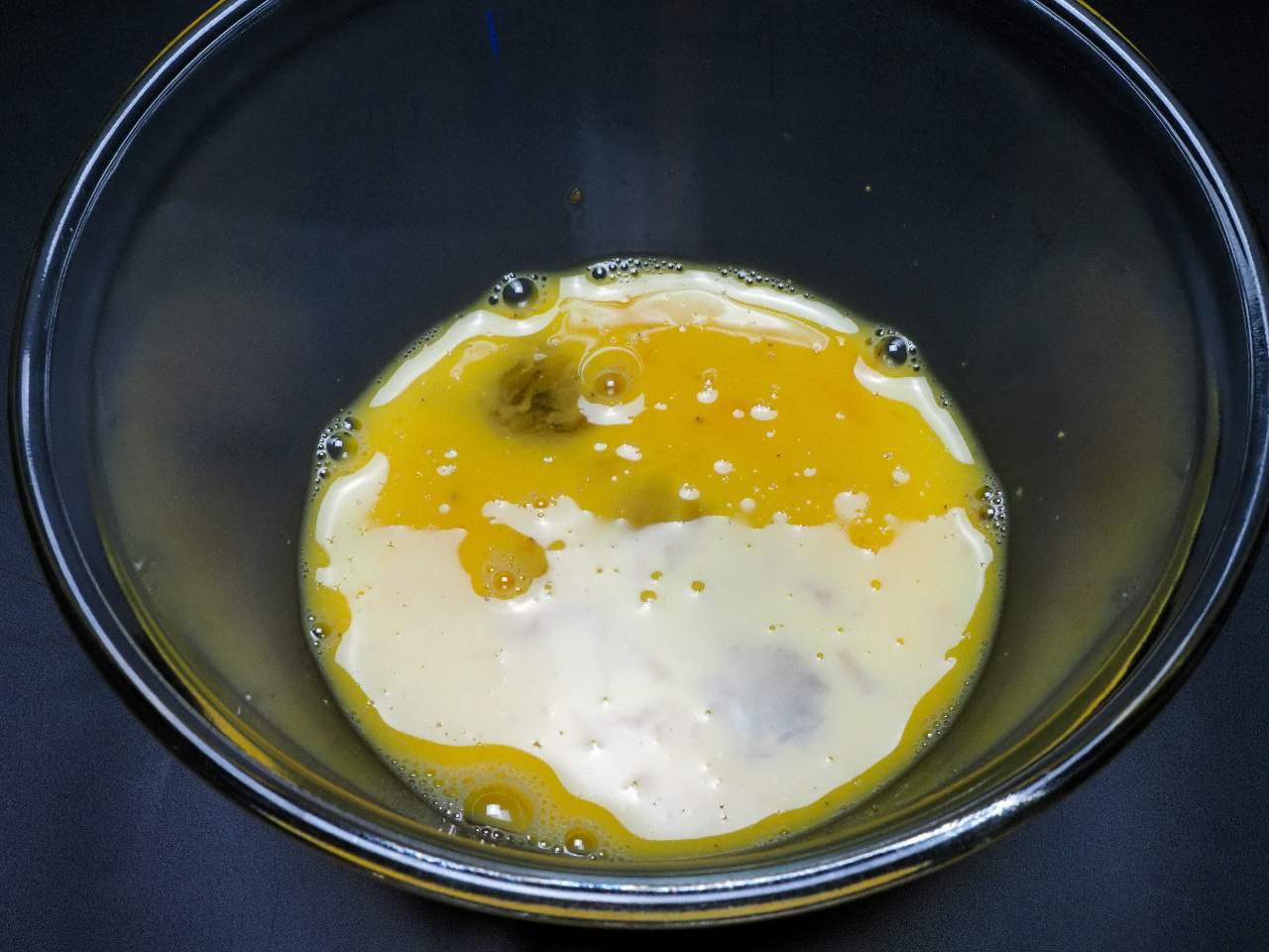 をタップしてごま油小さじ2を入れます。170℃に達してアラームが鳴ったら卵液を一気にフライパンに入れます。