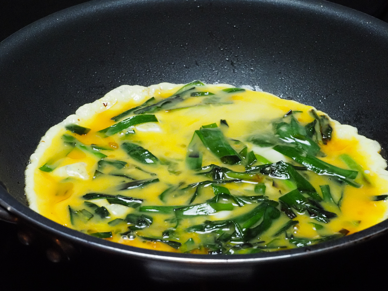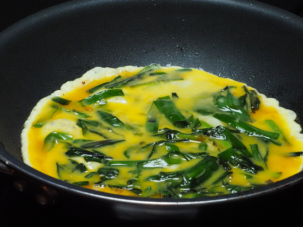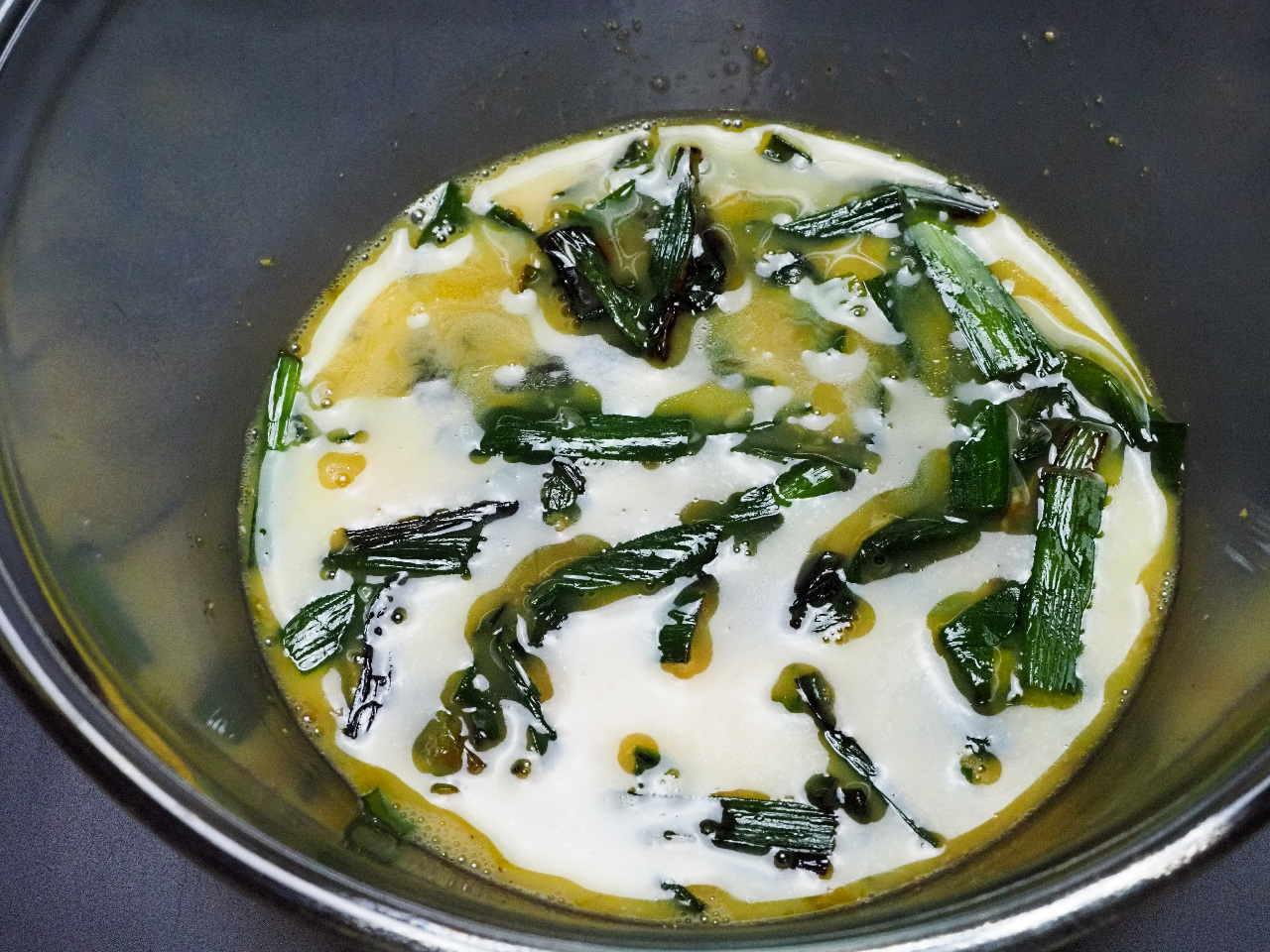 をタップして卵液の入ったボウルににらを入れて軽く混ぜます。